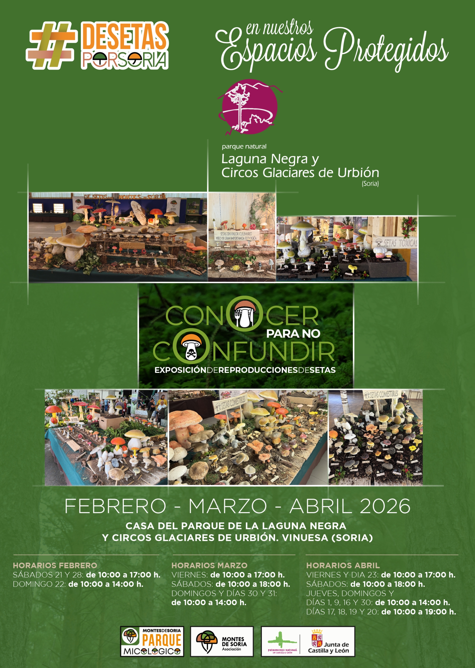 Una de las nuevas actividades que, desde el Parque Micológico Montes de Soria, se planteó y sigue un año más en este 2026 es el llevar nuestras exposiciones a los Espacios Protegidos de nuestro ámbito de actuación. Para ello, se ha contado con la colaboración de la Asociación Montes de Soria, la Fundación Patrimonio Natural de Castilla y León y el Servicio Territorial de Medio Ambiente de Soria. En esta ocasión os hablamos de la Exposición Conocer para no Confundir que está expuesta en la Casa del Parque de la Laguna Negra y Circos Glaciares de Urbión, ubicada a 4 km de Vinuesa. Visita, descubre y disfruta de todo lo que te ofrece el Museo del Bosque y las exposiciones y actividades que allí podrás encontrar.