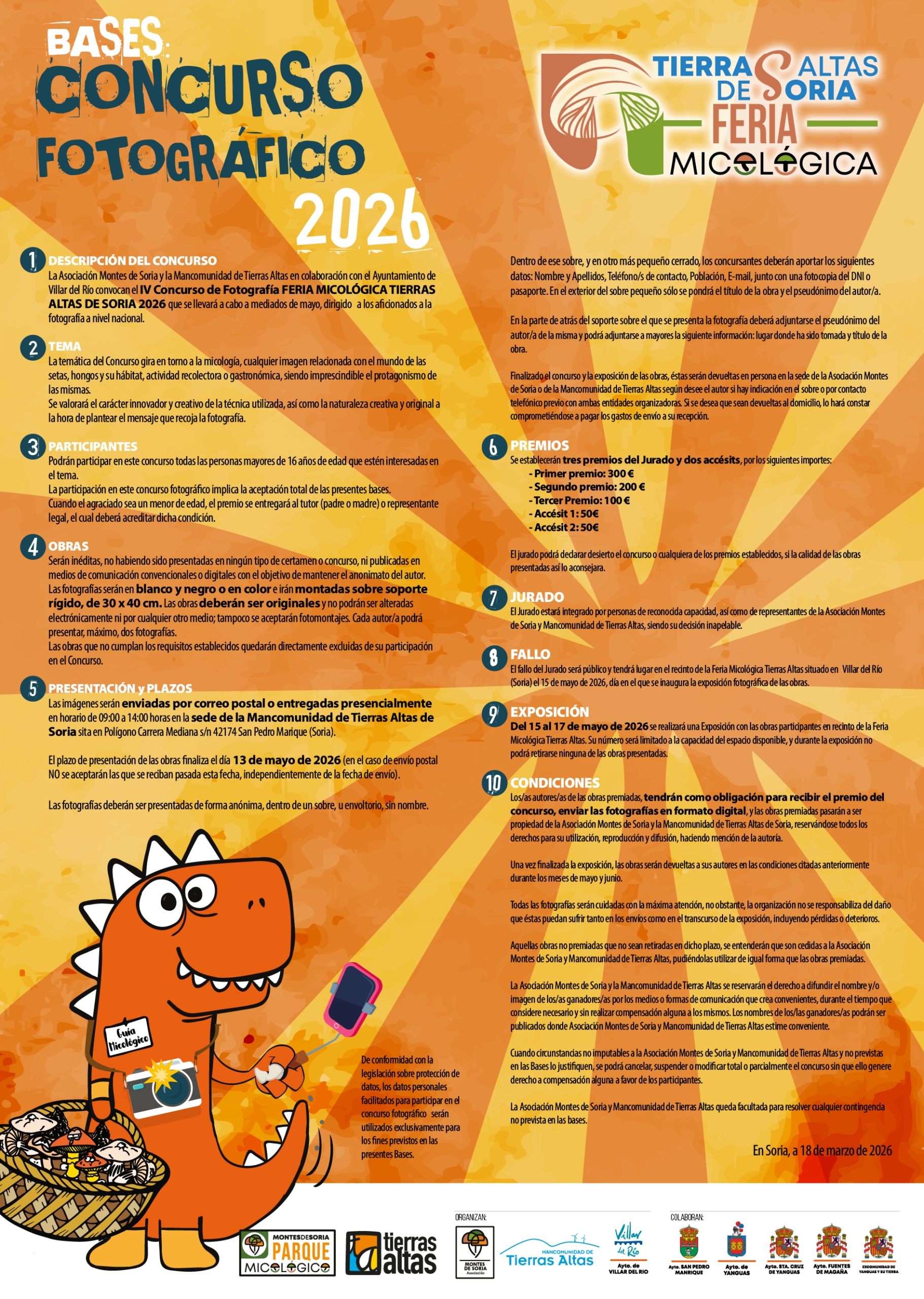 La Asociación Montes de Soria y la Mancomunidad de Tierras Altas en colaboración con el Ayuntamiento de Villar del Río convocan el IV Concurso de Fotografía FERIA MICOLÓGICA TIERRAS ALTAS DE SORIA 2026 que se llevará a cabo a mediados de mayo, dirigido a los aficionados a la fotografía a nivel nacional.