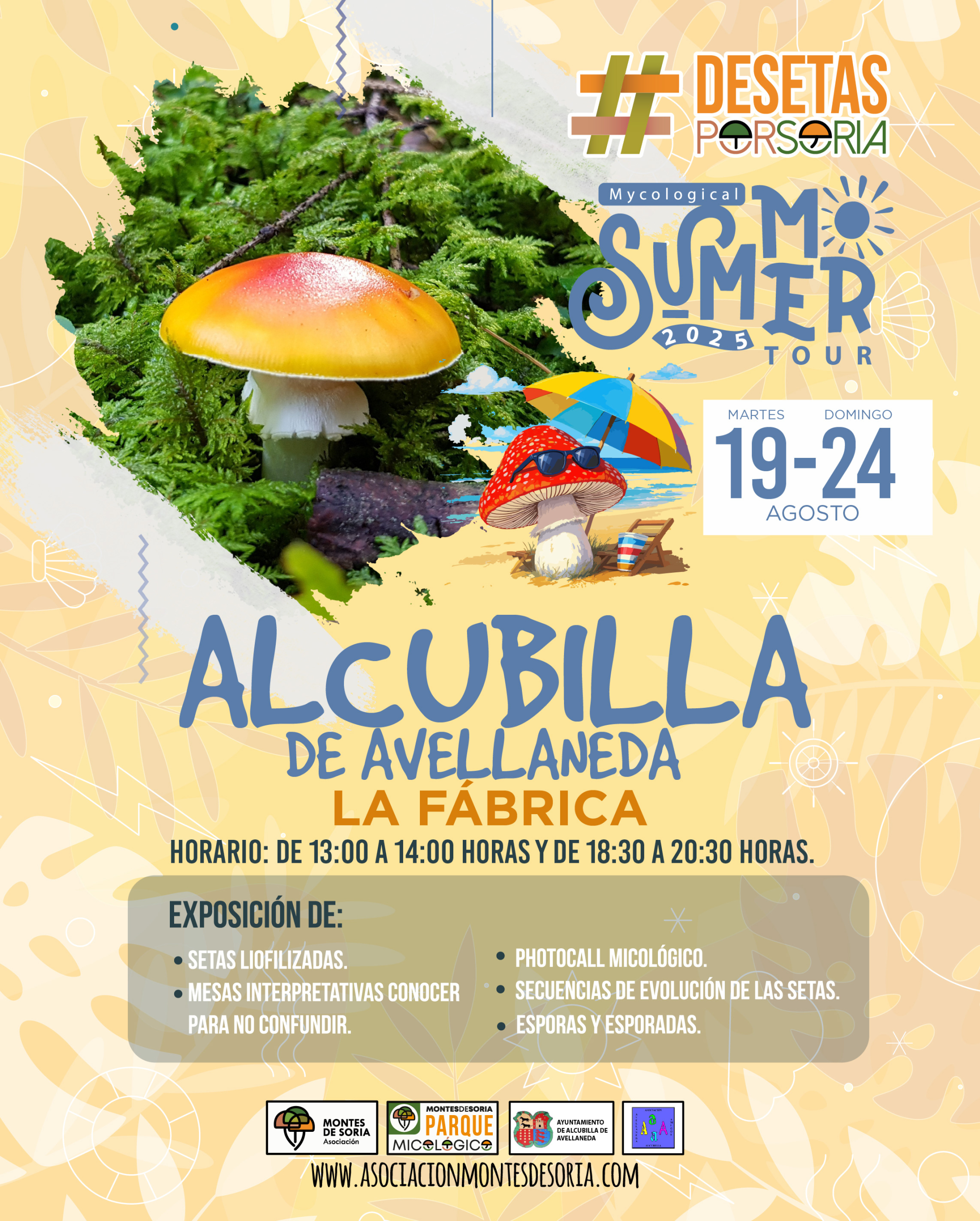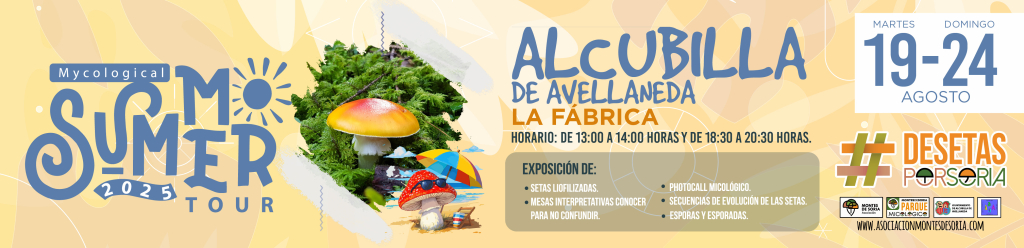 Participa en el # De Setas por Soria – Alcubilla de Avellaneda 2025 – Mycological Summer Tour, estaremos en La Fábrica con la gran exposición de setas liofilizadas, photocall, exposición Conocer para no Confundir y mucho más!! Ven, te esperamos!!