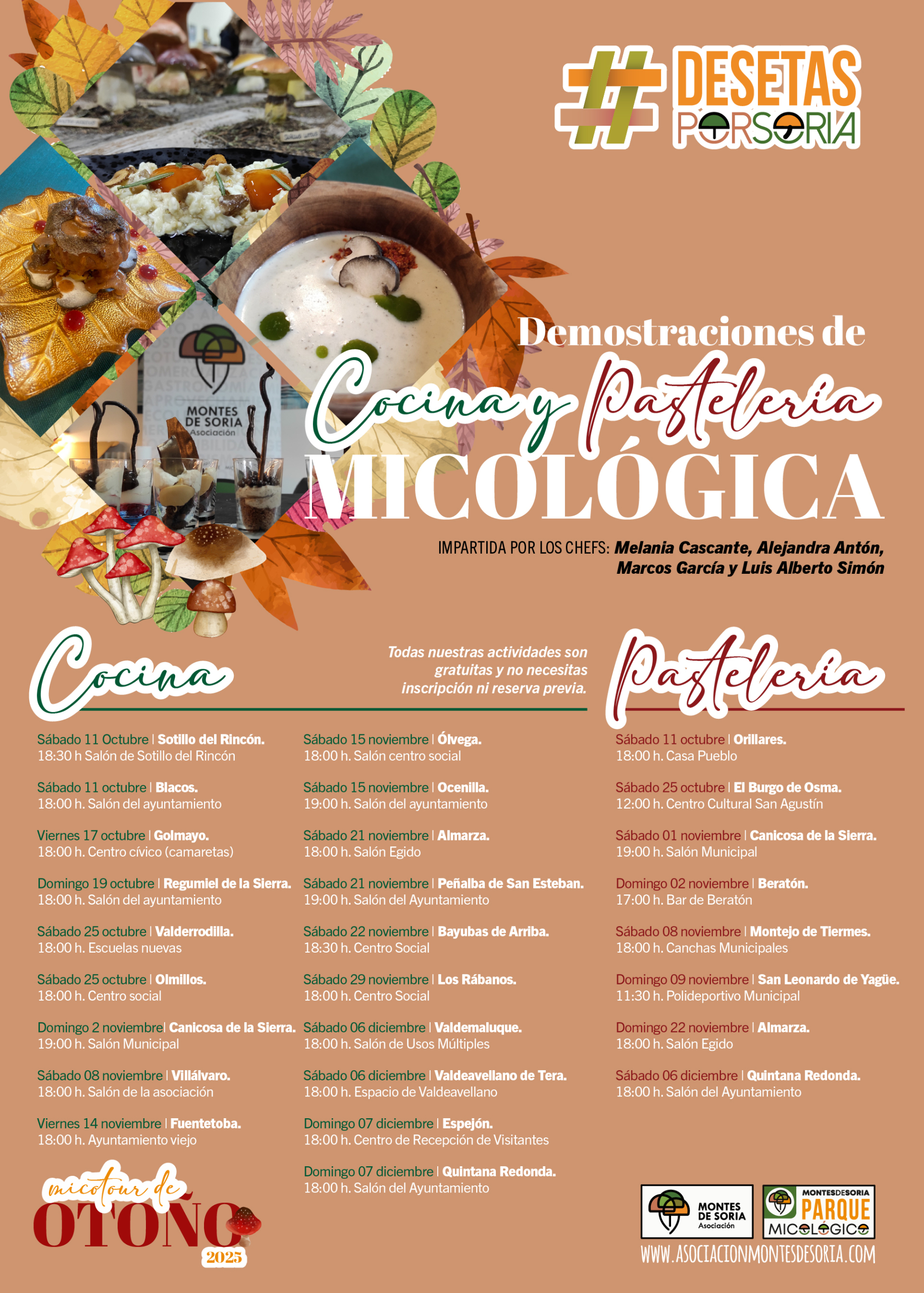 Descubre «# De Setas por Soria – Demostraciones de Cocina y Pastelería Micológica Otoño 2025″. Durante los meses de octubre, noviembre y diciembre recorreremos 27 localidades de la provincia de Soria y Burgos, 19 acogerán la cocina micológica de la mano de algunos de los mejores cocineros de nuestra tierra y en 8 localidades será la pastelería micológica la protagonista a través del mejor pastelero de España que introduce en su obrador de forma habitual las setas para llevarlas al mundo dulce. Aprende y disfruta de la micología de la mano de ellos en unas actividades que te sorprenderán y te harán conocer mucho más de la cocina micológica y podrás degustar las elaboraciones que se realicen. Busca las fechas y lugares que más te interesen y no dudes en participar!