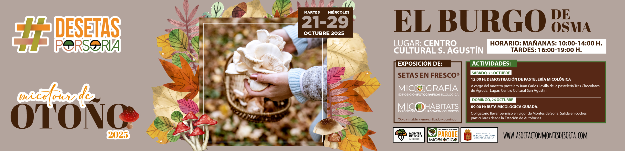 Descubre «# De Setas por Soria – El Burgo de Osma – Micotour de Otoño». Visitamos la villa episcopal de El Burgo de Osma con nuestras exposiciones, MICOhábitats, centrada en los diferentes hábitats productores de setas y MICOgrafía, exposición de fotografía micológica llena de preciosas imágenes de setas en alta calidad. No te pierdas esta muestra micológica que se complementará con otra de setas en fresco y una demostración de pastelería micológica en el precioso patio del Centro Cultural San Agustín.