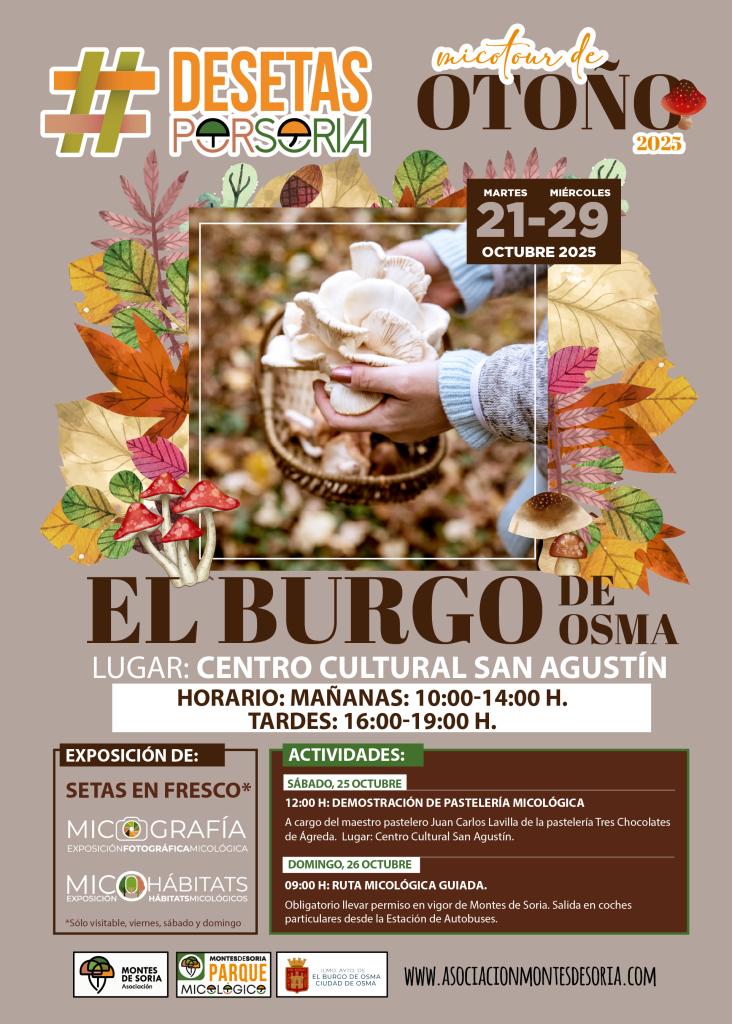 Descubre «# De Setas por Soria – El Burgo de Osma – Micotour de Otoño». Visitamos la villa episcopal de El Burgo de Osma con nuestras exposiciones, MICOhábitats, centrada en los diferentes hábitats productores de setas y MICOgrafía, exposición de fotografía micológica llena de preciosas imágenes de setas en alta calidad. No te pierdas esta muestra micológica que se complementará con otra de setas en fresco y una demostración de pastelería micológica en el precioso patio del Centro Cultural San Agustín.