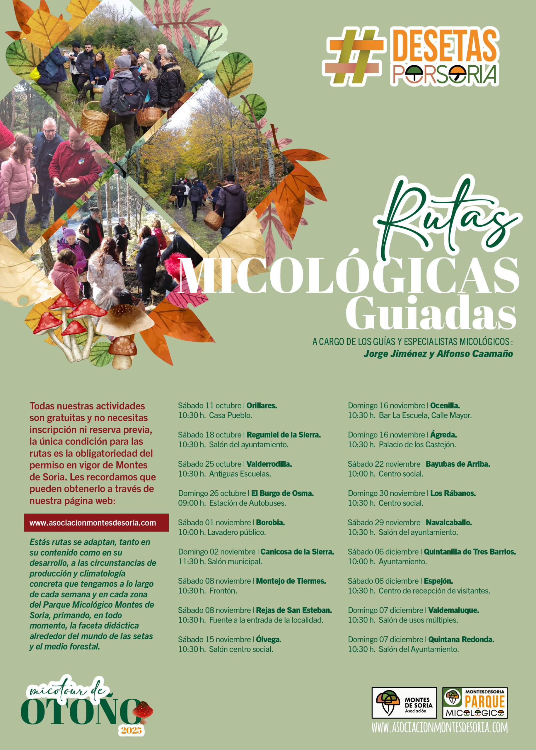 Descubre «# De Setas por Soria – Rutas Micológicas Guiadas Otoño 2025″. Durante los meses de octubre, noviembre y diciembre recorreremos 18 localidades de la provincia de Soria y Burgos, con alguno de los mejores guías y especialistas micológicos de nuestra zona. Aprende y disfruta de la micología de la mano de ellos en unas actividades que te sorprenderán y te harán conocer mucho más el medio forestal. Busca las fechas y lugares que más te interesen y no dudes en participar!
