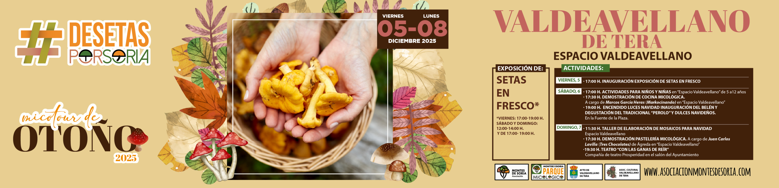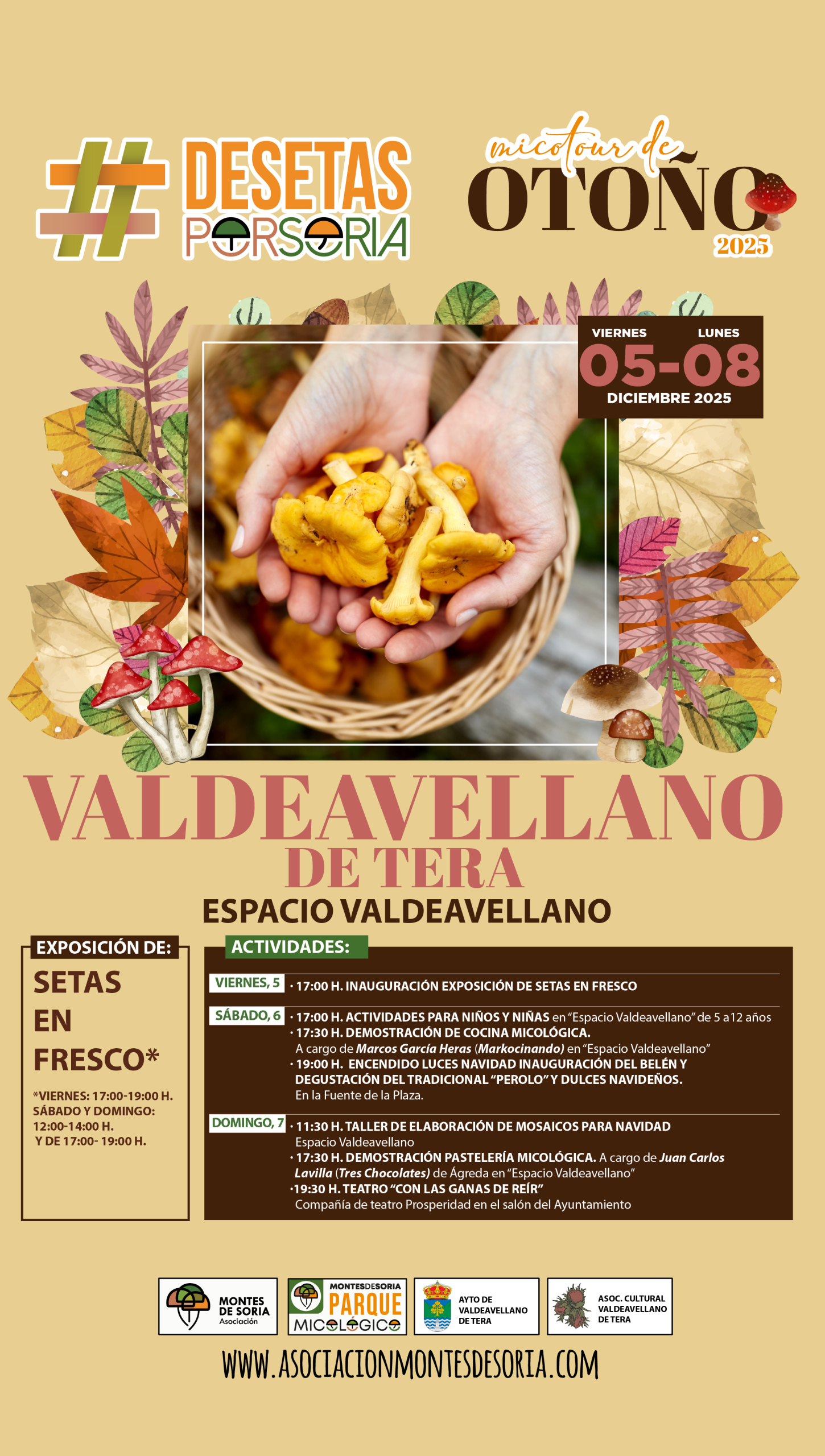 Comienza el mes de diciembre, descubriendo «# De Setas por Soria – Valdeavellano de Tera – MicoTour de Otoño 2025″ . Visitamos la preciosa localidad de Valdeavellano de Tera, situada en el centro de la comarca del Valle, llamada también la Suiza Soriana o denominado Valle de la Mantequilla. Estaremos allí con nuestras exposiciones micológicas itinerantes, un gran despliegue lleno de sorpresas para todos los públicos. No os perdáis sus exposiciones, actividades, talleres de pastelería y cocina micológica, y un sin fin de cosas más.