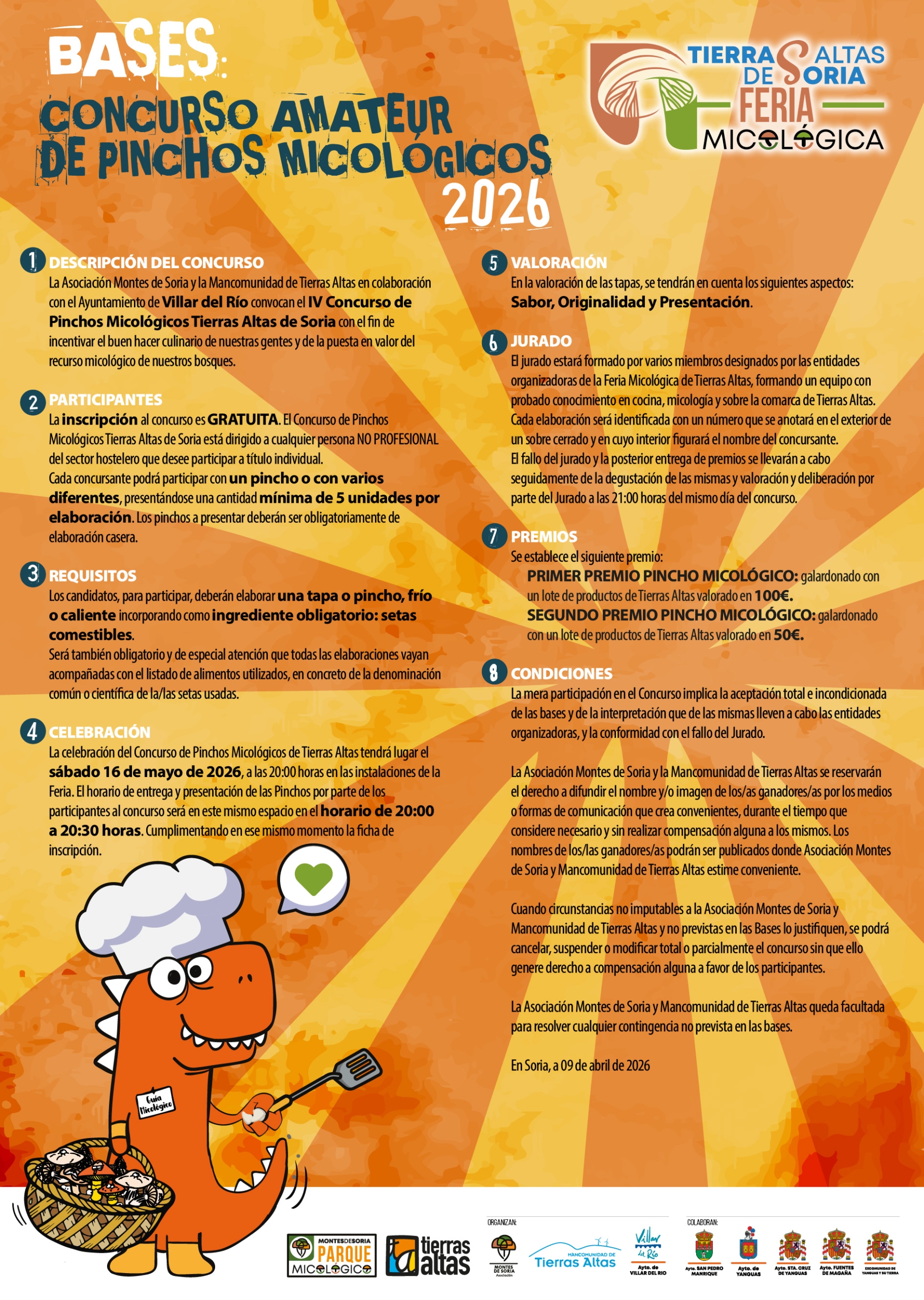 La Asociación Montes de Soria y la Mancomunidad de Tierras Altas en colaboración con el Ayuntamiento de Villar del Río, convocan el IV Concurso Amateur de Pinchos Micológicos FERIA MICOLÓGICA TIERRAS ALTAS DE SORIA 2026 que se llevará a cabo a mediados de mayo, dirigido a los aficionados que quieran mostrar su buen saber hacer en la cocina.